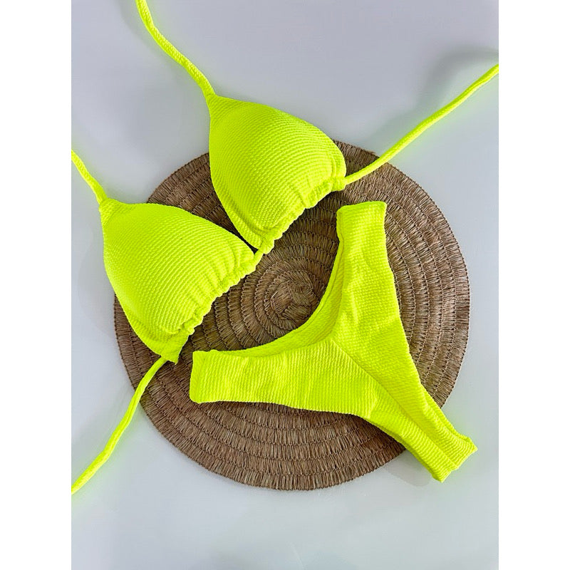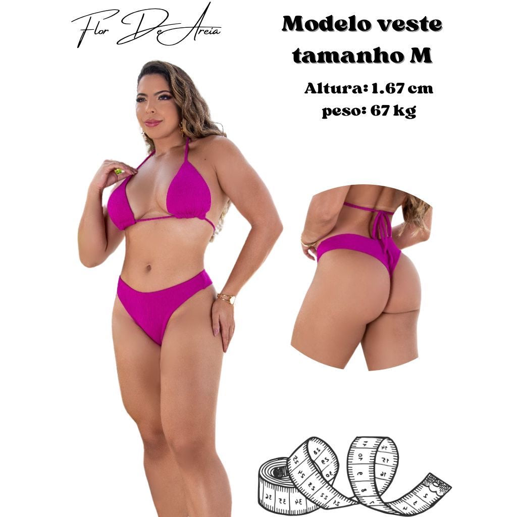 A calcinha fio duplo valoriza o corpo na medida certa, sem marcar, e o top cortininha ajustável permite o encaixe perfeito em diferentes tipos de busto.